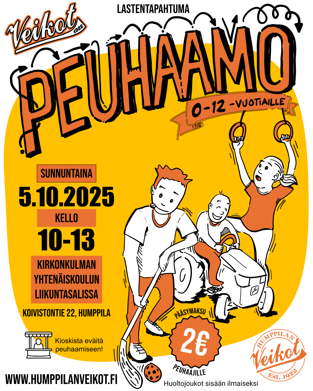 ✨PEUHAAMO 5.10.2025 klo 10-13✨ Kirkonkulman yhtenäiskoulun liikuntasali Eli hypitään, pompitaan, pelaillaan, juostaan, roikutaan ja temppuillaan! Ja tietenkin nautitaan kioskin maittavista herkuista! |